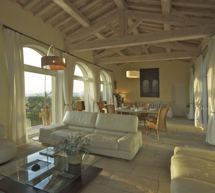 The ground floor of the house features bright, welcoming living spaces. The fully equipped kitchen opens onto a spacious dining area, perfect for enjoying meals with family and friends. The large lounge offers multiple seating areas and a media corner for relaxing. The sunroom, bathed in natural light from its floor-to-ceiling windows, provides stunning views over Venasque and the surrounding valleys, with additional lounge areas and a large table to fully enjoy dining in the heart of Provence